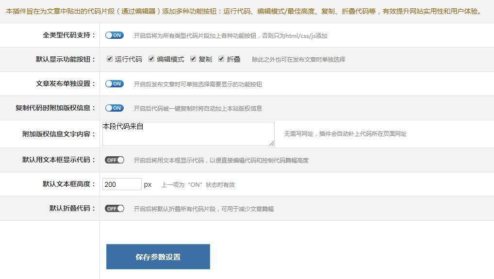 本插件旨在为文章中贴出的HTML/CSS/JS代码片段添加“运行代码”、“复制”、“编辑模式”、“折叠”等功能按钮,也能为PHP、JAVA、ASP等所有程序类代码添加除“运行代码”以外的功能按钮,不影响原有代码高亮效果。