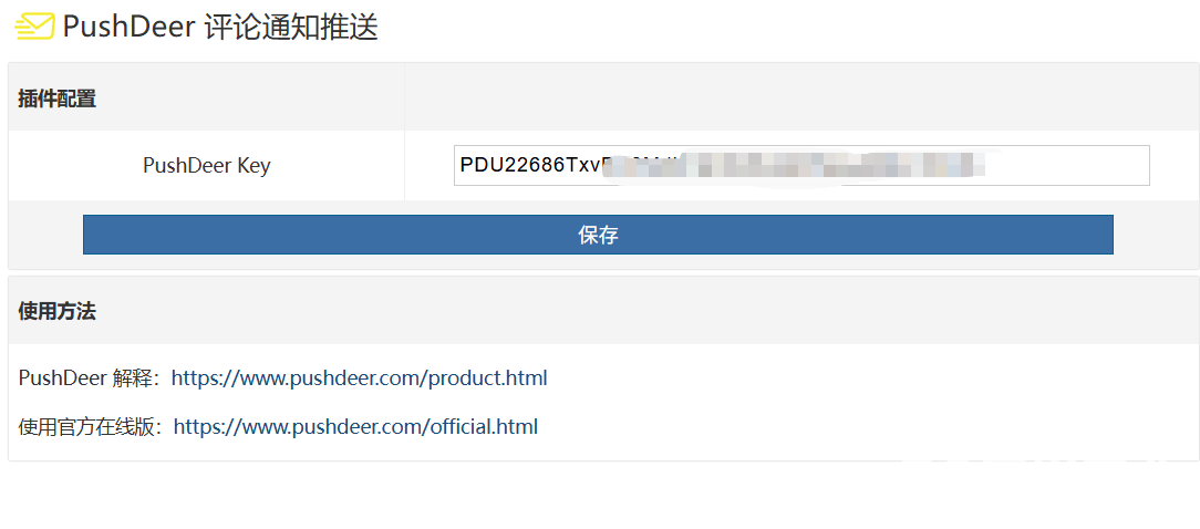在手机应用 Key 内获取密钥后,到插件后台填写 PushDeer Key 就启用了。